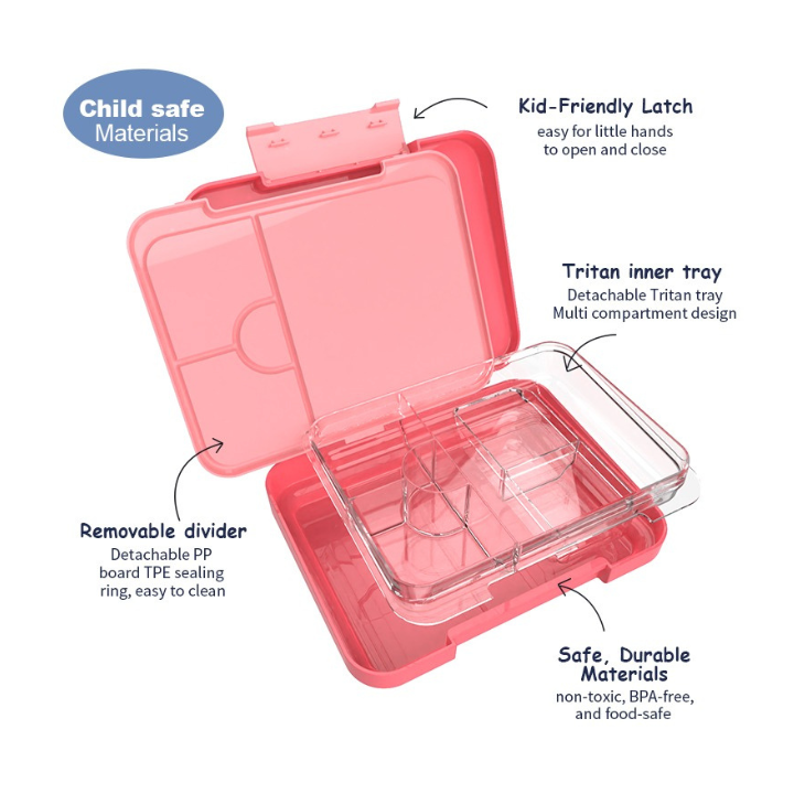 · Safe & Durable: Free from BPA, PVC, and Phthalates — so you can rest easy knowing your child’s lunch is safe from harmful chemicals. Made from ABS (outer shell), Tritan (inner tray), and Silicone (seal).
